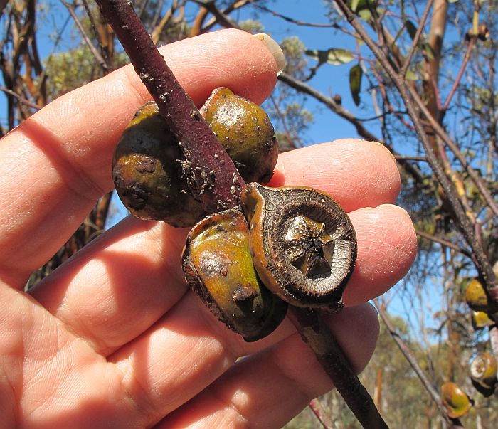 This species grows in mallee country to the north of Esperance and is found around 80 or so kilometres (50 miles) from the coast. It is very habitat specific preferring a heavy brown clay loam, noted for its sunken hollows known as crab-holes; it does not become swampy, but holds water well after prolonged rainfall. These habitats are usually dominated by Eucalyptus creta, but are mostly only a few hectares/acres in area, although over a few km/miles there could be several.